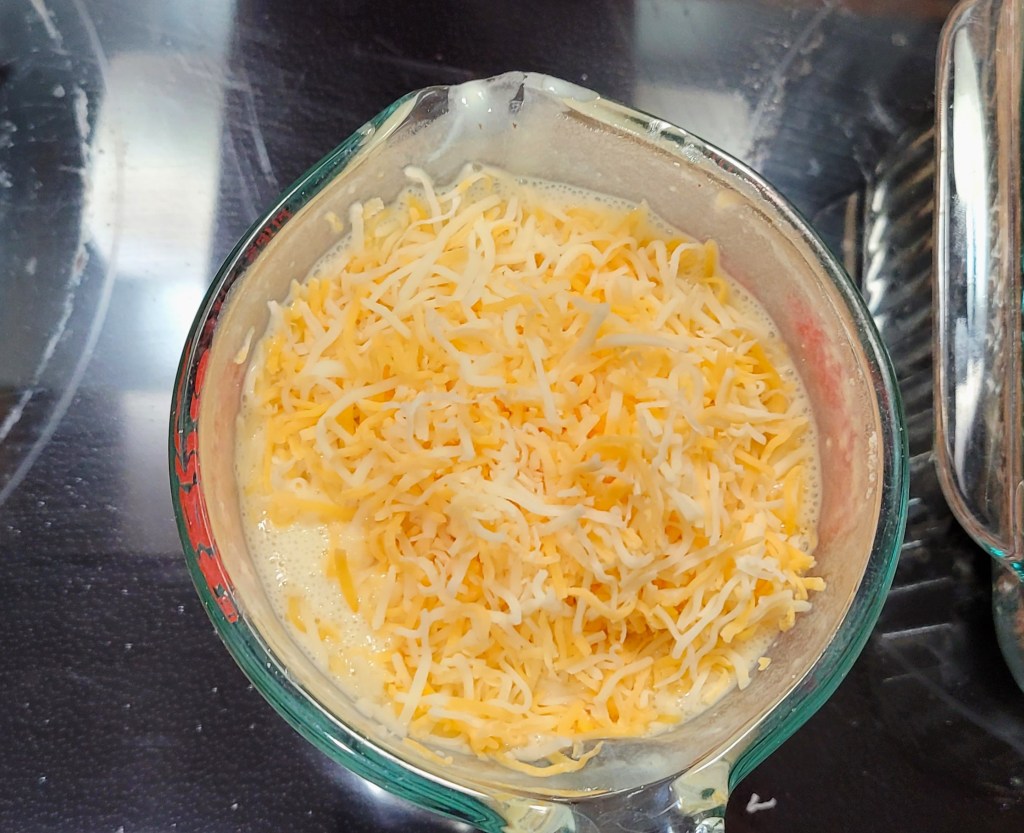 9. Put one cup of the shredded cheese into the bowl and stir it in to the batter.