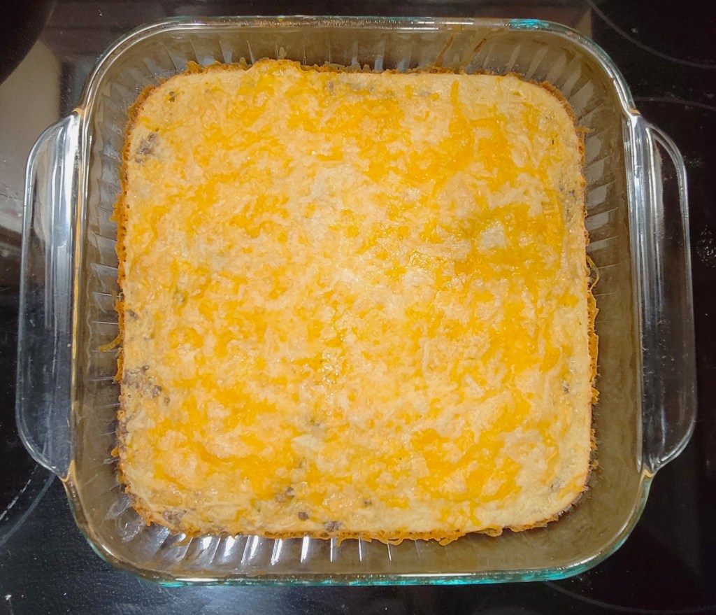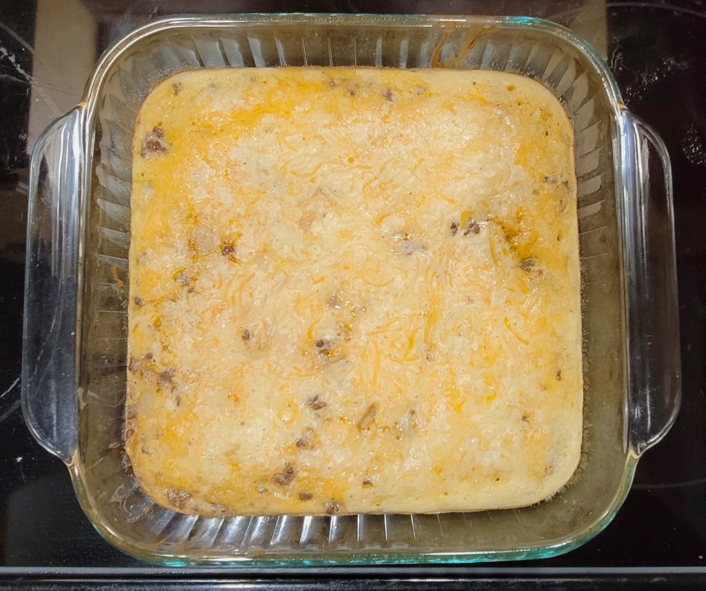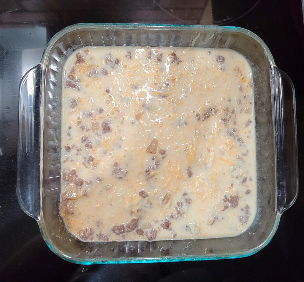 11. Pour the Bisquick and cheese mixture over the ground beef, again making sure it’s spread evenly across the dish.