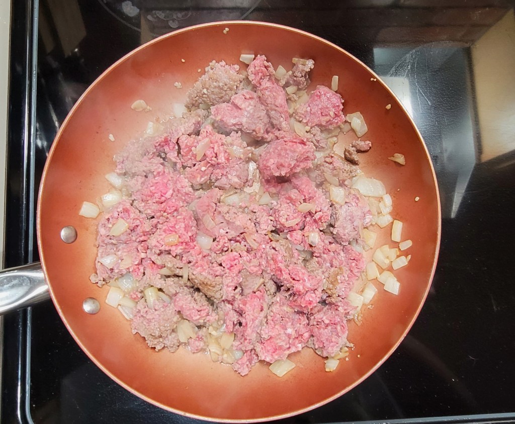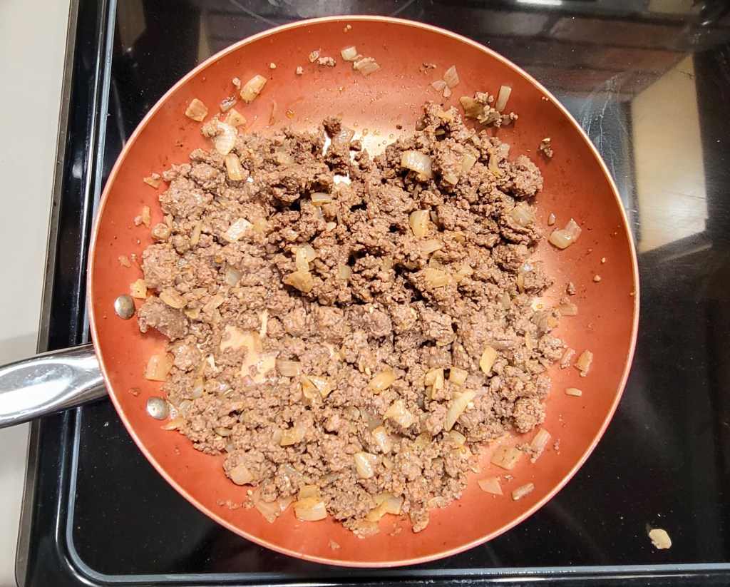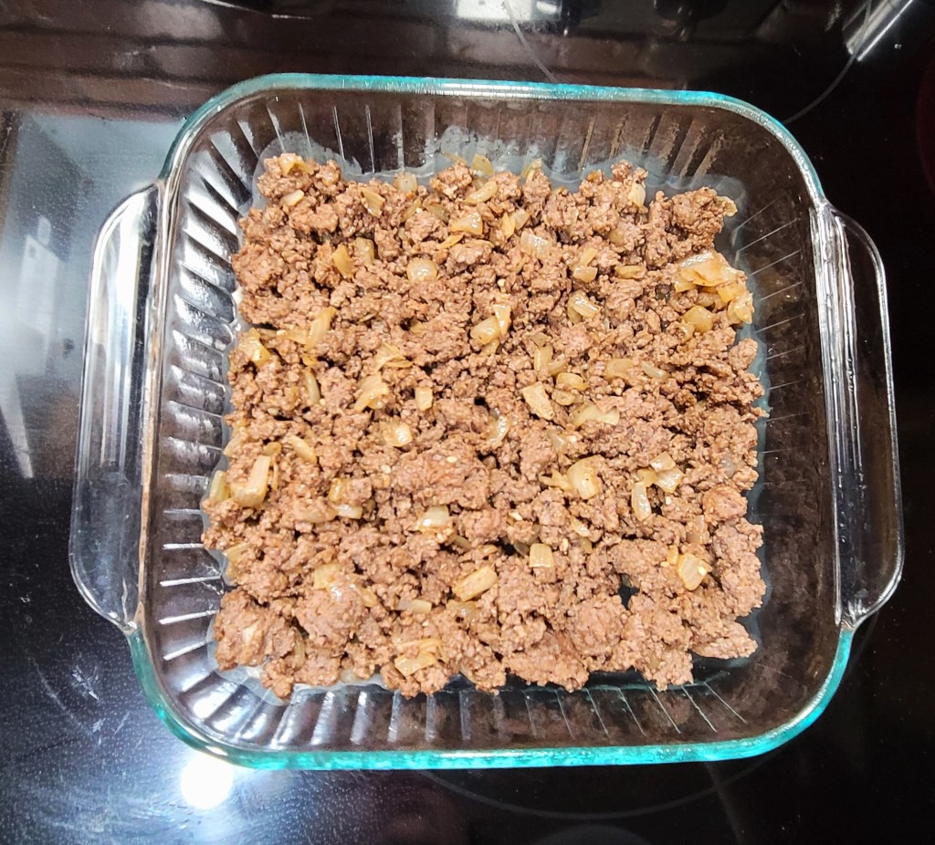 10. Grease a 9×9 inch casserole dish and pour the ground beef in, making sure it is spread evenly in the dish.